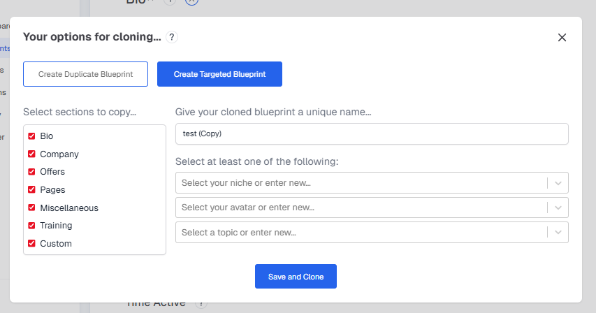 Creates a Blueprint that targets a specific avatar or buying group. You can select from an existing avatar or manually add a new one, then choose which sections of the original Blueprint to keep.